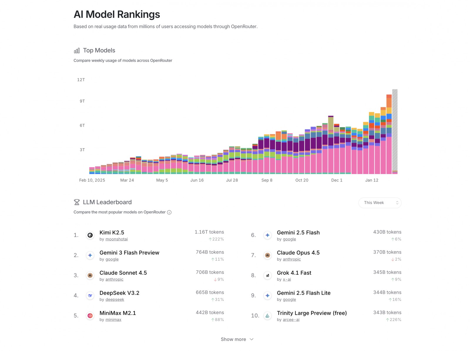 Kimi K2.5 ha superado ampliamente a competidores como Gemini 3 Flash Preview y Claude Sonnet 4.5, alcanzando más de 1.16 billones de tokens en uso, lo que representa una ventaja superior al 50% sobre estos modelos.