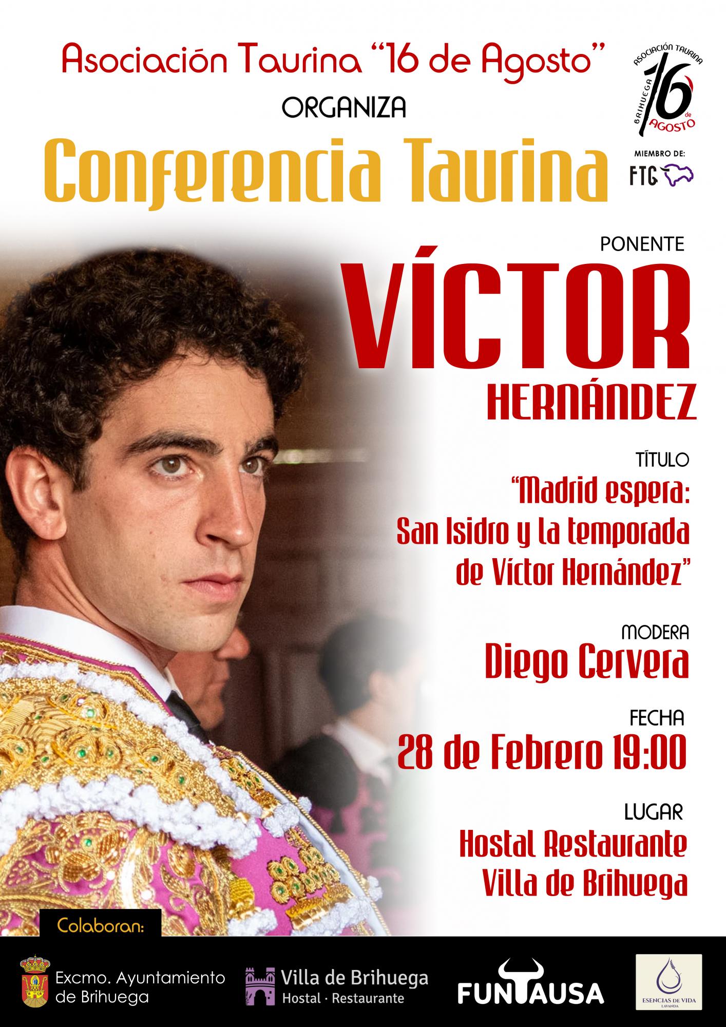 La Asociación Taurina “16 de Agosto” de Brihuega ha organizado una conferencia taurina que tendrá como protagonista al matador de toros Víctor Hernández, una de las jóvenes figuras más destacadas del escalafón actual.