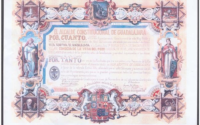 Para esta edición se ha seleccionado la réplica del diploma original expedido en 1888 por el Ayuntamiento, mediante el cual se reconoció a María Diega Desmaissières y Sevillano, Duquesa de Sevillano y Condesa de la Vega del Pozo, como Hija Adoptiva de Guadalajara . El documento, ricamente ilustrado con escudos, figuras alegóricas y motivos ornamentales, simboliza el profundo aprecio que la ciudad mostró hacia una mujer cuya influencia social, cultural y filantrópica marcó decisivamente la vida local en el último tercio del siglo XIX.