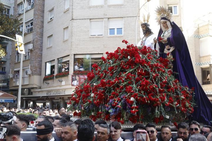 El cortejo procesional ha comenzado su desfile por las calles del barrio de la Trinidad, donde se agolpaban miles de personas con ramos de claveles que le iban lanzado a su paso hasta el Hospital Civil, donde se han vivido momentos de gran emoción.