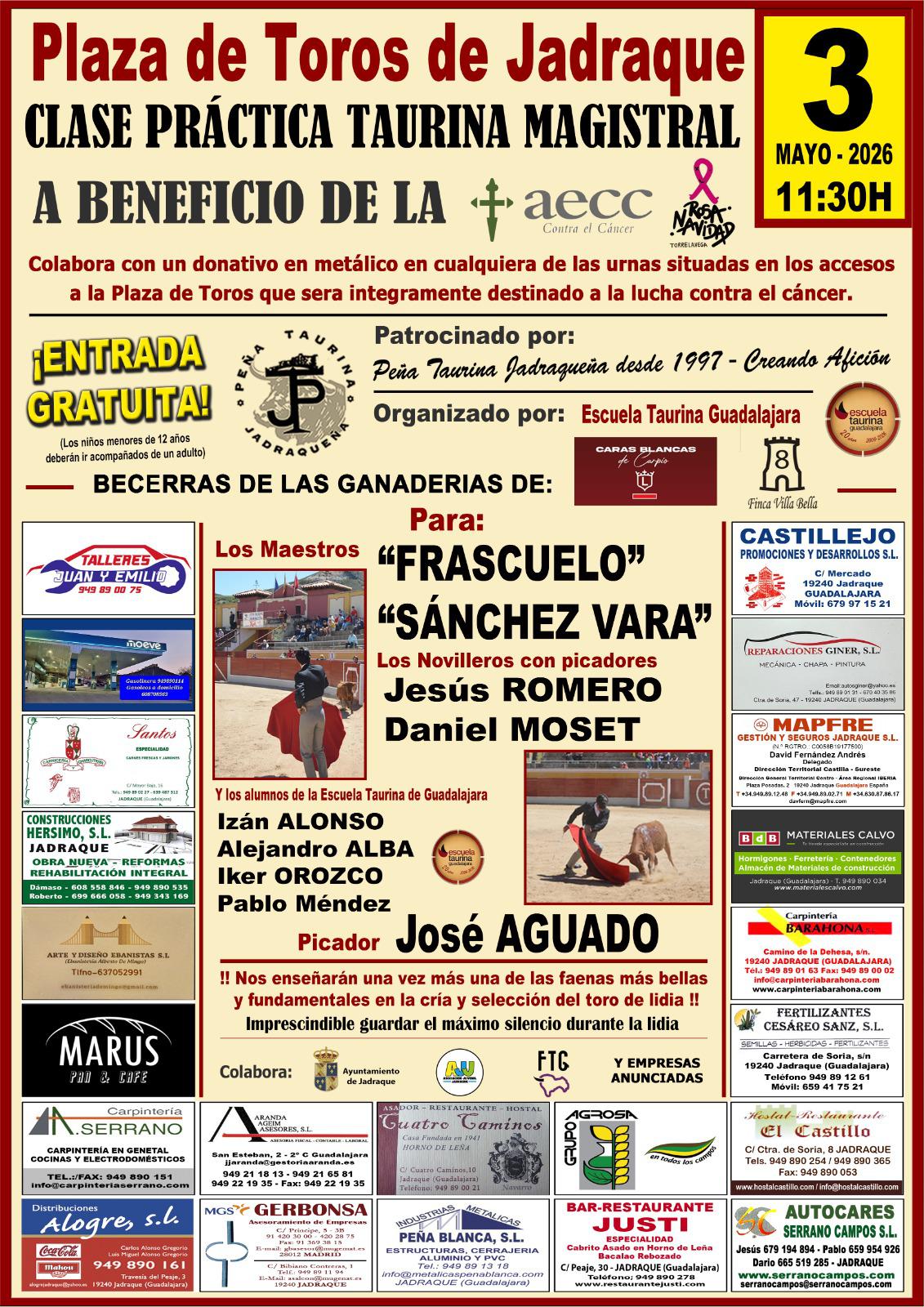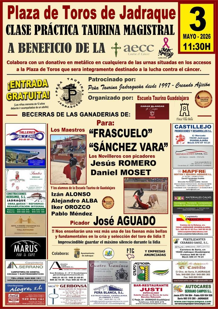 El acto principal se celebrará el domingo 3 de mayo, a las 11:30 horas, en la Plaza de Toros de Jadraque, con una Clase Práctica Taurina Magistral a beneficio de la Asociación Española Contra el Cáncer (AECC), organizada por la Escuela Taurina de Guadalajara, con el patrocinio y colaboración de la Peña Taurina Jadraqueña, así como con el respaldo del Ayuntamiento de Jadraque.
