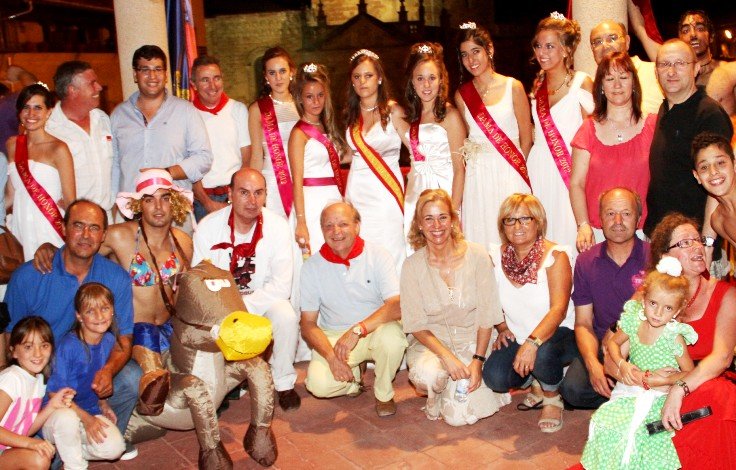 Poco más adelante, en el momento de pasar por delante de la Catedral, sus campanas recibían la alegría seguntina, parecía que también expresando la suya. En el tramo final del desfile, y en el momento de máxima afluencia de público, cerca de 2.000 personas se congregaban en el entorno de la Plaza Mayor, abarrotándola de humanidad. Una vez todas las carrozas llegaron a su destino, al filo de las nueve y veinte de la noche, y mientras los peñistas se lo pasaban en grande siguiendo el ritmo de las charangas, llegaba el momento del chupinazo. Eran primero los representantes de las peñas “El Pifostio” y “Grupo Mixto” quienes daban los cuatro vivas a San Roque, a la Virgen de la Mayor, a Sigüenza y a las peñas que fueron coreados atronadoramente. Le siguieron los del alcalde, José Manuel Latre, para terminar con los últimos y definitivos que pronunciaba la reina de las fiestas, Beatriz Catalinas, bien flanqueada por sus damas de honor, Alba Bodega, Paloma Mateos, Lorena Rodrigo, Andrea Mateos, Laura de Mingo y Celia Alda. Entonces Rodrigo Martínez, representante de “El Pendón”, peña que este año cumplía sus primeros veinte años, era el encargado de prender la mecha del cohete. Atronador, estalló en lo alto del Palacio de los Deanes, para darle el pistoletazo de salida a las fiestas de San Roque y de la Virgen de la Mayor. Las treinta y nueve peñas registradas en el Ayuntamiento estallaron de júbilo al tiempo que se encendía detrás el luminoso “San Roque 2012”